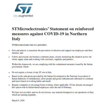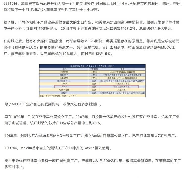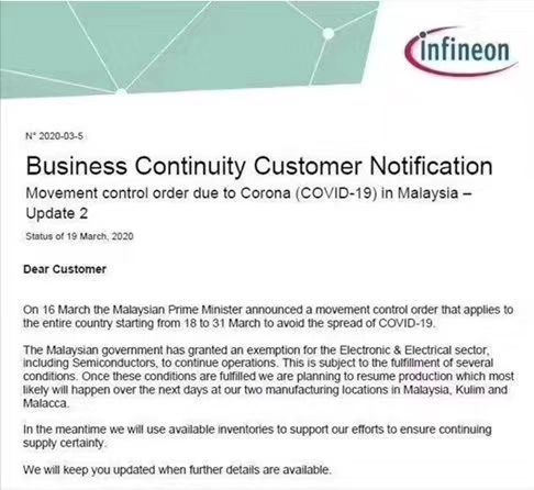 疫情阴影下的半导体供应链发表时间:2020-03-25 15:03 截至文章编写之刻起,海外(除中国)新冠累计确认病例265869例,现存病例主要集中在欧洲(意大利,西班牙,德国,法国等)和北美(美国)地区。 3月22日,印度实施一天的“公共宵禁”并呼吁民众“自愿居家、避免外出”。此外,还宣布22-29日暂停全部国际客运航班入境。22日,印度铁路系统宣布取消3500多趟列车,这意味着全国铁路几乎停运。 3月19日,ST意法半导体宣布其法国工厂产能至少削减50%。 ST如此,其他几家欧洲半导体巨头能好过?恩智浦(NXP)、英飞凌也必然受影响。 因为疫情,ST、瑞萨等MCU厂商均发出供货预警。 3月17日,马来西亚17日宣布自3月18日至3月31日全国封城14天。公告显示,除了必要的民生、运输及公共设施外,境内企业和工厂都要求停工两周。马来西亚是日、台系企业电阻产品的制造重地,其中尤以台湾电阻厂商为重,华新科技、旺诠(奇力新旗下)很大比例的电阻产能都在马来西亚。除电阻产品外,日本村田(电感、MLCC)、Nichicon和Nippon Chemicon(铝电解电容)和松下(固态电容)都有产能在马来西亚。同时,马来西亚是东南亚的后端半导体制造中心,英特尔、英飞凌、日月光、ST等知名半导体公司均在该国建厂。2018年前后,苏州固锝、通富微电、华天科技三家中国半导体厂商先后宣布并购马来西亚的封测厂。除此,全球晶圆制造大厂——环球晶在马来西亚设有6寸晶圆厂(另两座6寸以下晶圆厂位于中国昆山和台湾地区),此次马来西亚封城,将对相关企业产能带来一定程度的影响,业界已传出6寸晶圆开始涨价的消息。后来,虽然马来西亚对重要的物资和半导体产品等开启绿色通道,但企业工厂减产、出货迟缓等问题依然可能无法避免。 除此,英特尔的处理器(CPU)在马来西亚当地有后段的产能(约占总CPU后段产能的50%),这或许会让本已处于缺货状态的CPU产品“雪上加霜”。 菲律宾首都马尼拉自3月15日起“封城”(社区隔离)30天,往返马尼拉的海、陆、空所有交通都被暂停。据了解,首都马尼拉拥有菲律宾既有的8个机场中最主要的3个机场。MLCC产能将受到重创。 如下相关产业报导: 村田和三星电机的MLCC主要应用于智能手机、汽车、工业、医疗等高端市场,村田和三星电机停产、停运,将对高端MLCC市场造成冲击。 随着疫情的扩散,会有更多的国家进入“戒备”状态,业界对此表示十分担忧。 另外一个比较吸引大家眼球的是美股史无前例的多次熔断,3月19号,美股发生本月第四次熔断,也是有史以来美股第五次熔断,其中,具体到美股半导体市场不少个股跌幅已超过 50%。借此,小编臆测,丢了的钱,一定需要从其他地方找回来,未来极有可能会面临一波原厂端发起的涨价潮。 由于“疫情”在全球范围内持续发酵,使得全球消费电子产品供需受挫,如今三星、OPPO、VIVO等手机制造商也暂停印度工厂的生产,若无法寻求解决方案避免停工的风险,不仅影响企业智能型手机产能下滑,也会导致2020年全球智能型手机出货成长的“美梦”破碎,呈现持续下滑的趋势。 新冠肺炎疫情波及全球,更是给欧洲和北美两大汽车产业中心地区蒙上阴影。据不完全统计,截至3月19日,包括戴姆勒、大众、菲亚特克莱斯勒集团(FCA)、标致雪铁龙集团(PSA)等在内的12家海外车企已经关停或计划关停的工厂将超过100家。中国汽车市场上,中国汽车工业协会副秘书长叶盛基表示,疫情将对汽车行业一季度的运行影响巨大。如果疫情在3月底得到有效控制,预计一季度产销量下滑45%左右,上半年产销量下滑25%左右。 相应的其他各个行业,均受到不同程度的影响。 至此,依据前面事实的罗列,不难看出,疫情对半导体供应链最大的影响便是交期延误,并会由此引发价格上涨。 但是,在此同时呼吁大家理性备货,如果您有确认稳定的需求,一定要合理安排提前备货,备货请找荣德,我们将竭诚为您服务。 公司网址:www.honortech-int.com 联系热线:0755-82990157 |